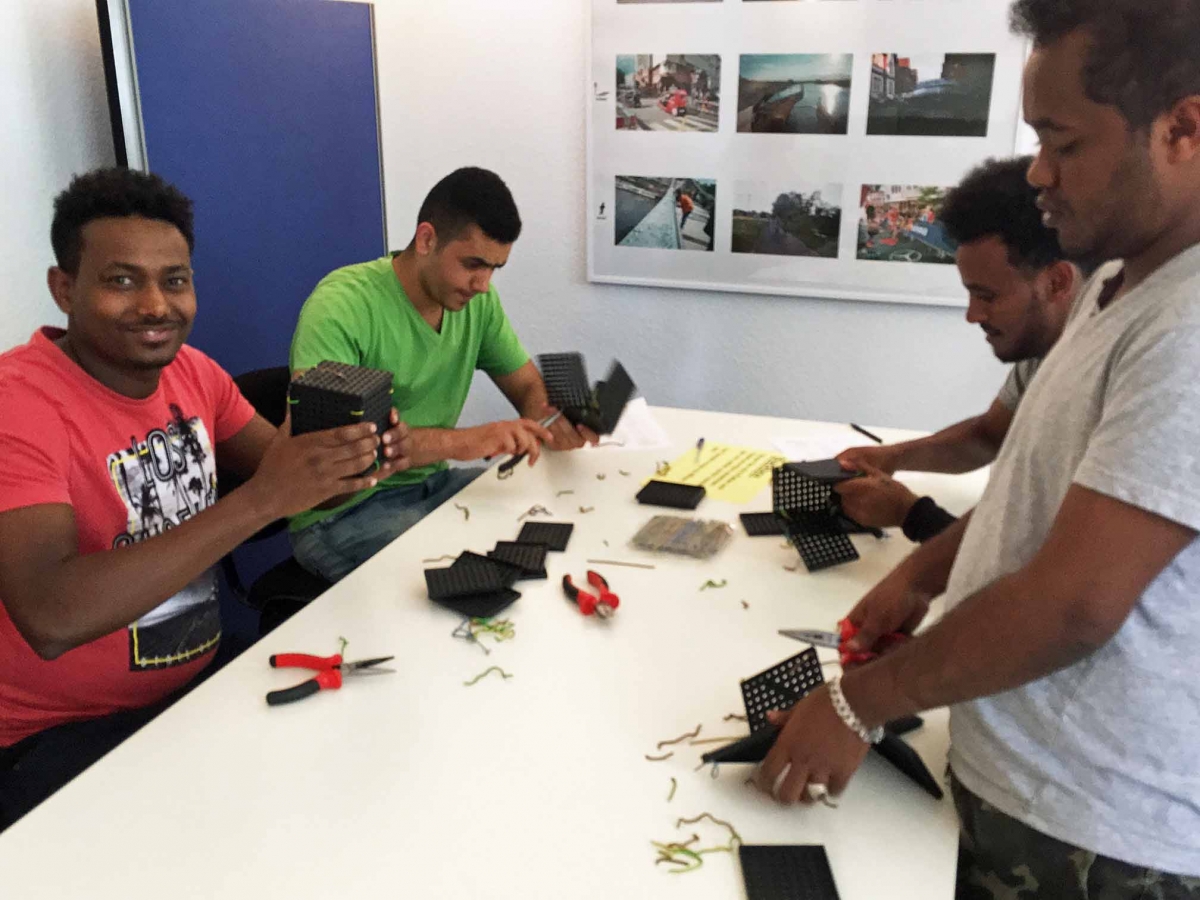 Nach einer kurzen Erklärung der Stationen konnten die teilnehmenden Geflüchteten reibungslos mit den praktischen Tests arbeiten. „Die Teilnehmer hatten sehr viel Spaß und konnten uns ihre Interessen deutlich machen,“ berichtet JOBLINGE Kompass-Mitarbeiter M. Sahin. „Gleichzeitig wurden sie bei Stationen wie dem ‚Katzenhaus‘ oder dem Modul ‚Elektro-Verteilerdose‘ sehr gefordert, was ihnen ebenfalls gefiel. Die vielfältigen Stationen führten dazu, dass die Teilnehmerinnen und Teilnehmer auch zum Schluss noch sehr engagiert dabei waren,“ so Sahin weiter.